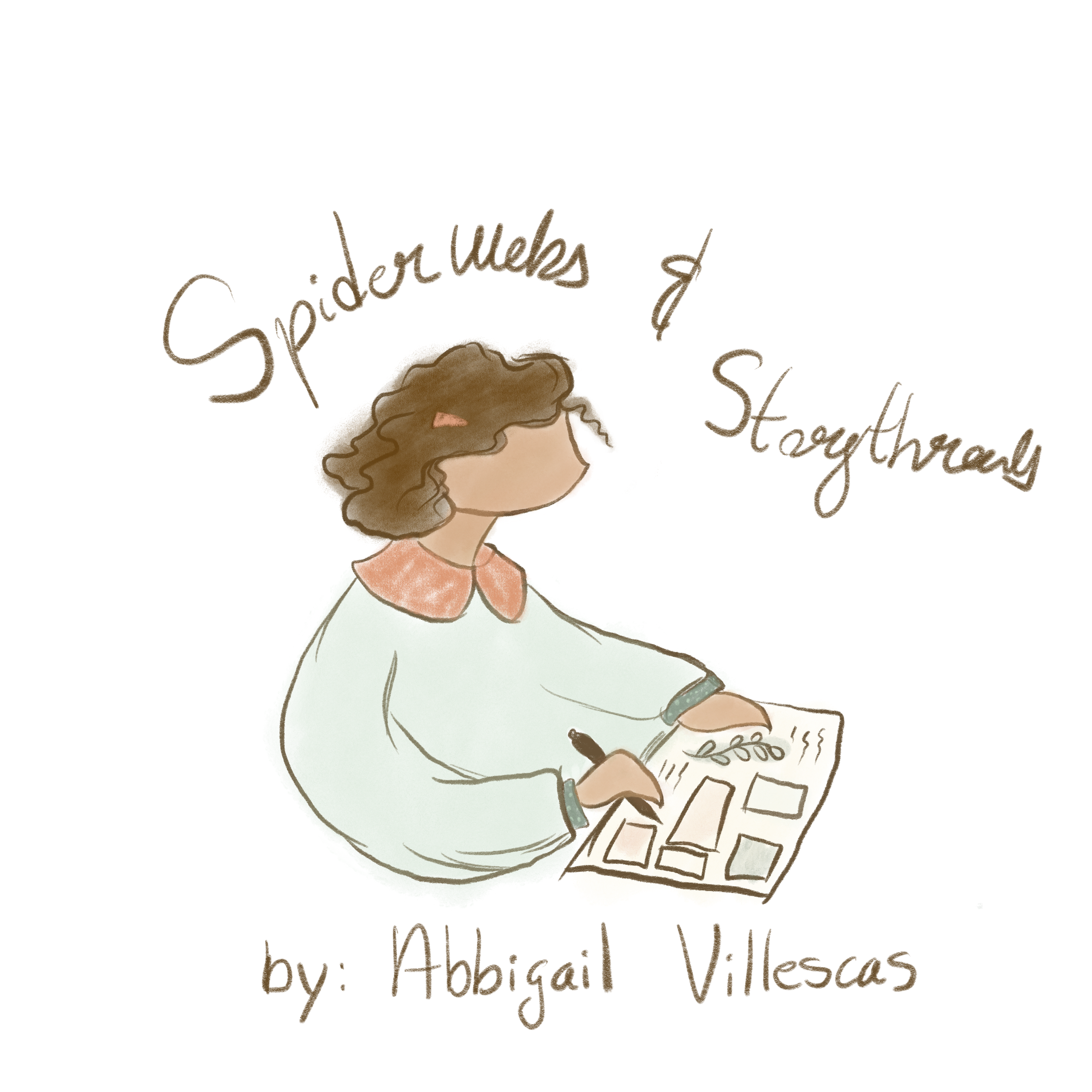 A hand-drawn logo illustration featuring a girl with brown hair and vintage clothing sitting at a desk with pencil illustrating a picture, logo illustration for spiderwebs and storythreads substack, abbigail villescas